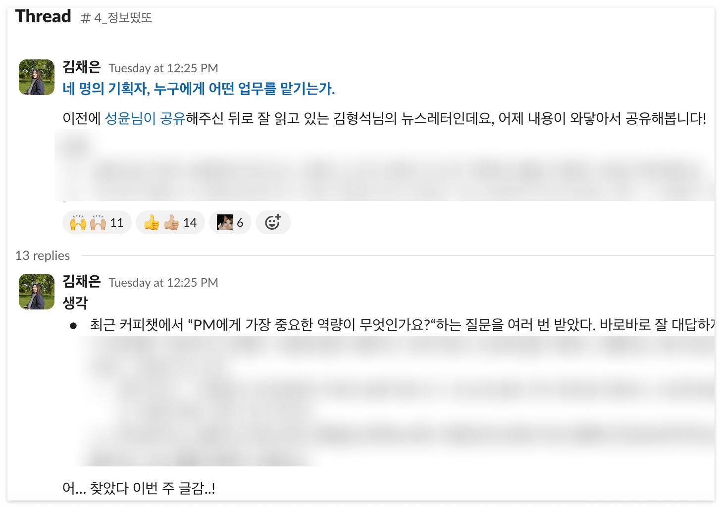 아래 링크의 글은 다이버시티의 필자 김형석님이 똑닥 공동대표이던 당시, 두 명의 시니어와 두 명의 주니어 기획자에게 업무를 어떻게 분배했는지에 대한 글이다. 리더로서 사람에 대한 이해를 기반으로 의사결정하는 좋은 예시라고 생각한다.