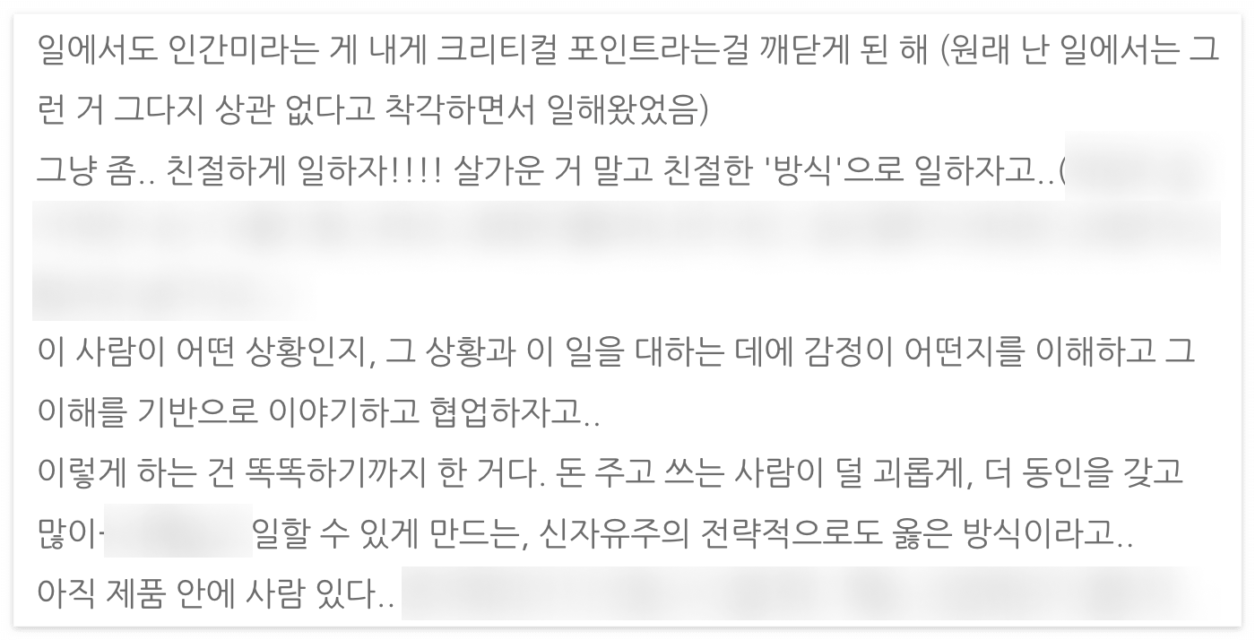 이런 갈증을 적절히 표현할 말을 찾지 못해 '인간미, 친절'이라는 말을 내뱉고 항상 설명을 덧붙여야 했다. 또 그렇게 말하자니 '너무 감상적으로 들리지는 않을까'하는 생각에 마음껏 역설하지 못했고, 괜히 다른 기술적인 용어들로 한번 감싸 '커뮤니케이션을 잘해야 한다'와 같은 모호한 말로 퉁치기도 했다.