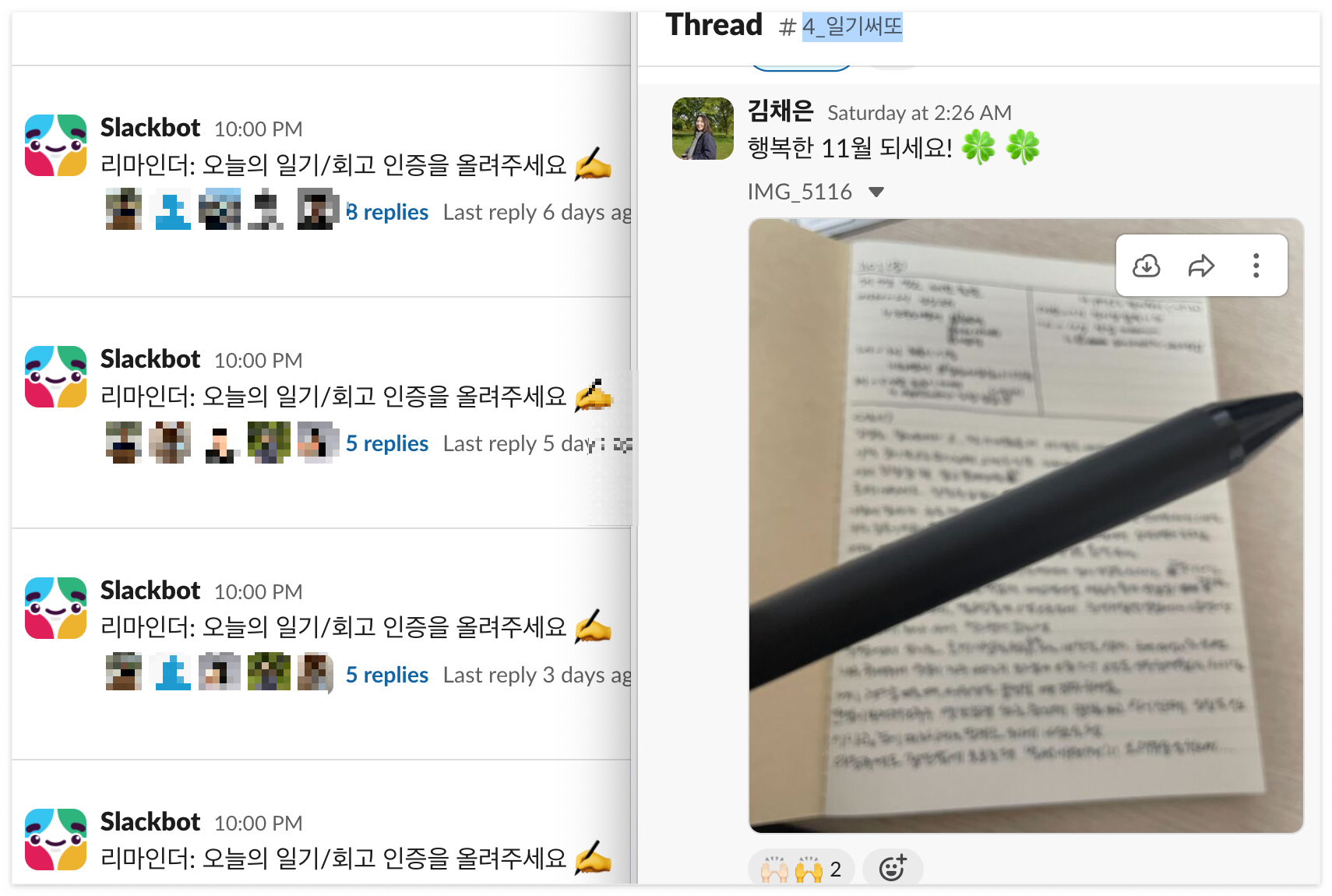 하나는 일기이다. 글또의 소모임 #일기써또 덕분에 약 한달 반째 매일 일기를 쓰고 있다.