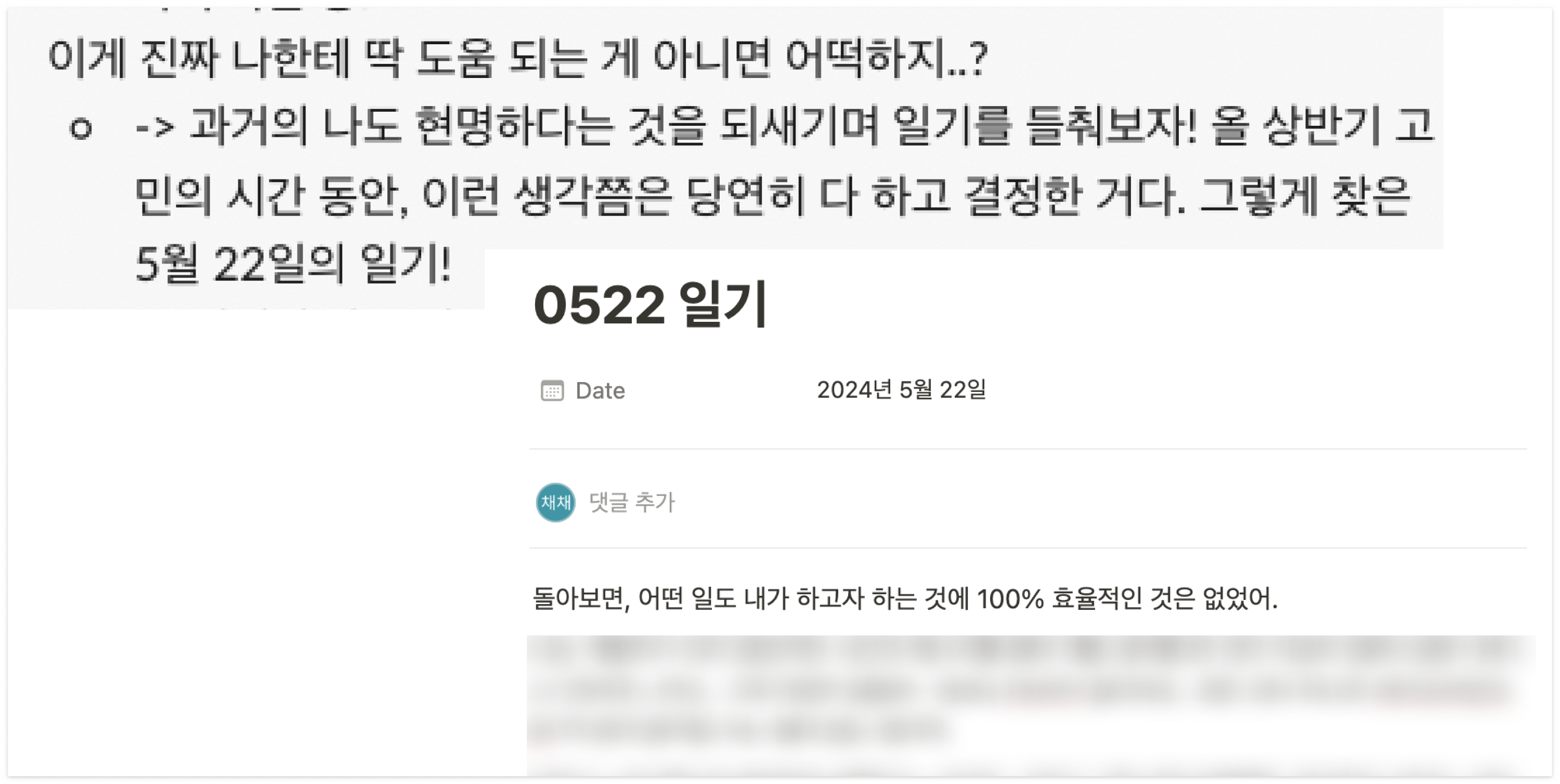 특히 별 거 없다고 생각했던 일상의 기록이 나중의 나에게 무언가를 주는 경험이 반복되면, 오히려 일기를 더 가볍게 쓸 수 있게 된다.