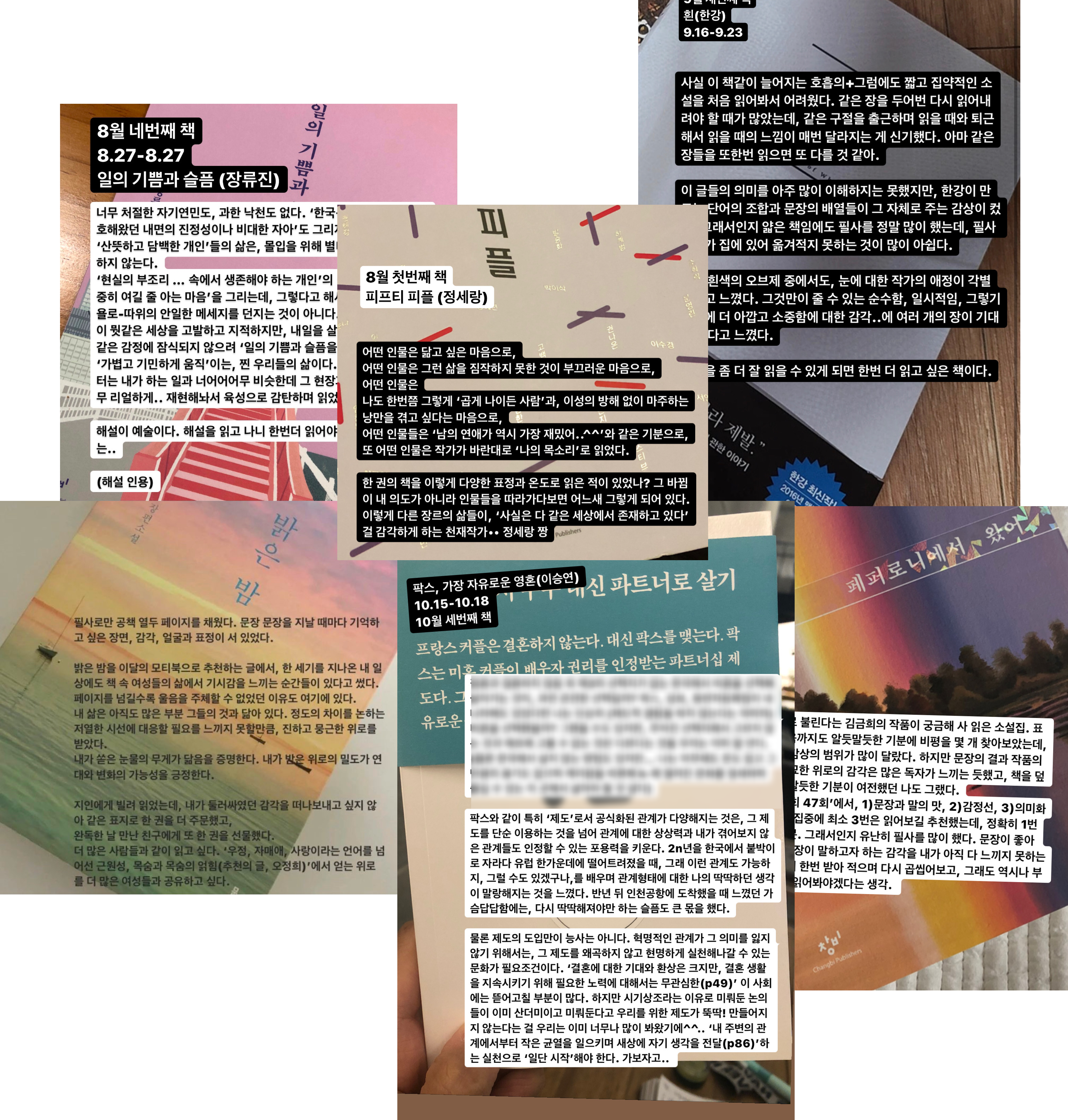 짧은 감상글은 온라인 독서인증 모임에 올리기 위해 쓰기 시작했는데, 모임을 나오고 나서도 책을 읽을 때마다 아주 짧게라도 썼다. 책에 관한 글이었지만, 내가 골라 읽은 책에 대해 나만의 감명을 담은 것이기에 나에 대한 글쓰기이기도 했다. 학교의 매개 없이 자유의지로 내 자아를 담아 쓴 첫 종류의 글이었다. 한두 문단 남짓이었지만 감상을 쓸 때에는 대학에서 쓰던 글처럼 나만의 작은 공론장이 휴대폰 위에 펼쳐지는 기분이었고, 놓쳐가던 인격적인 성장의 바짓가랑이를 잡는 기분이었다.
