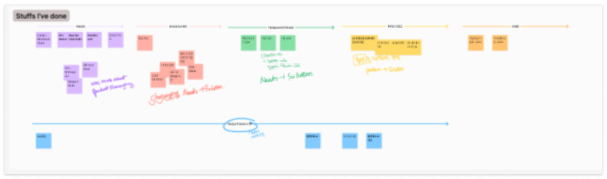 시각적으로 내가 한 일들을 한 판에 펼쳐보고 적절한 프로젝트 단위로 묶어보면서 후보들이 1차적으로 걸러질 수 있었다. 프로젝트 단위로 표현하기 어려워서 자연스럽게 제외되는 경험들도 있었고, 다른 프로젝트에 비해 몸집이 작아 포트폴리오에 담을 재료가 절대적으로 부족해 보인다거나 하는 대략적인 감각이 세워지기도 했다.