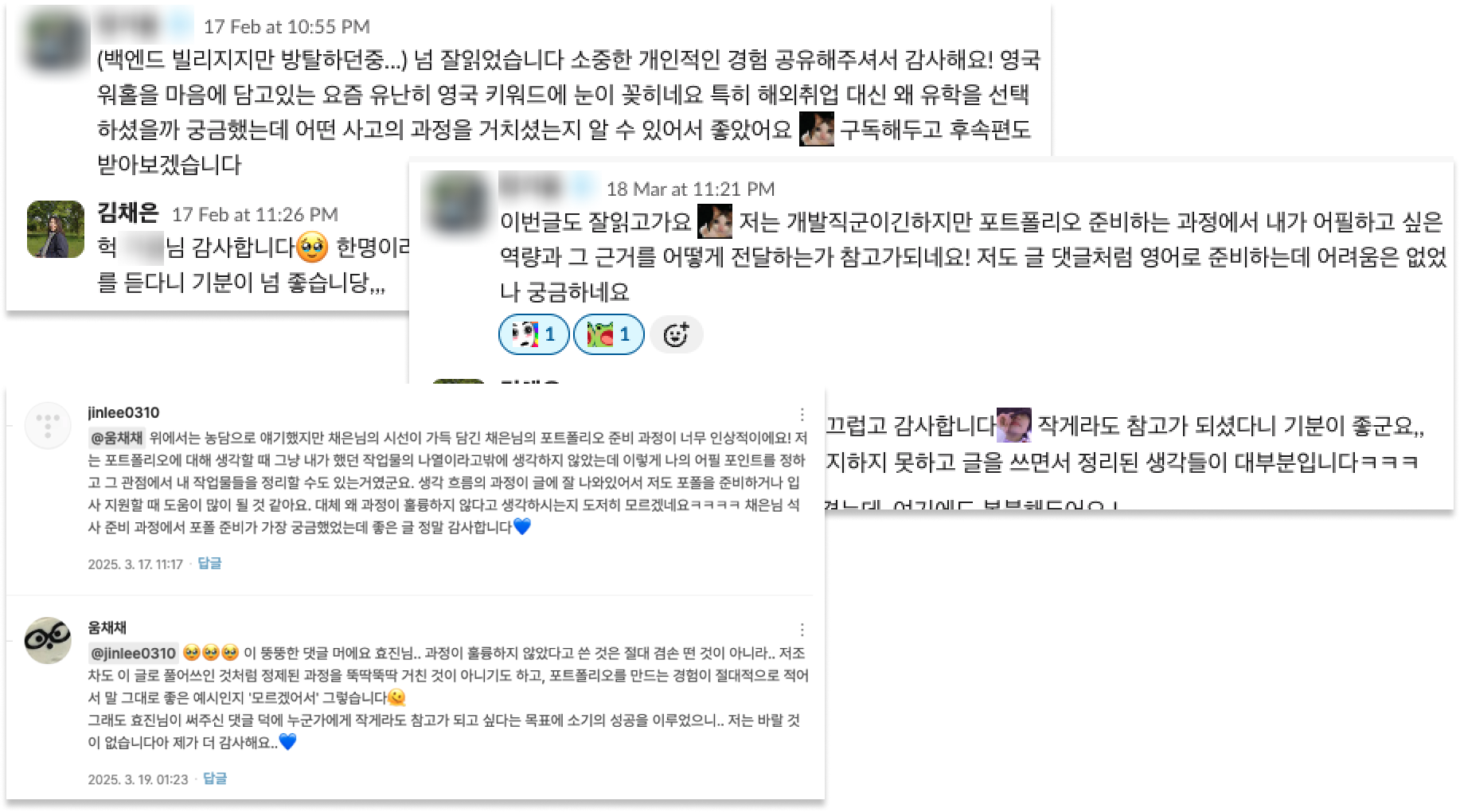 하지만 사실 관심은 좋은 거거등요.. 이따금 내가 쓴 글에 글또 분들이 티나는 반응이나, 적극적인 감상을 남겨주실 때면 딱 -🥹- 이 표정으로 행복해하곤 했다. 글 말미에 습관처럼 '누군가에게 도움이 되길 바라며' 하고 쓴 것을 현실에서 마주할 때의 짜릿함은 생각보다 크더라.