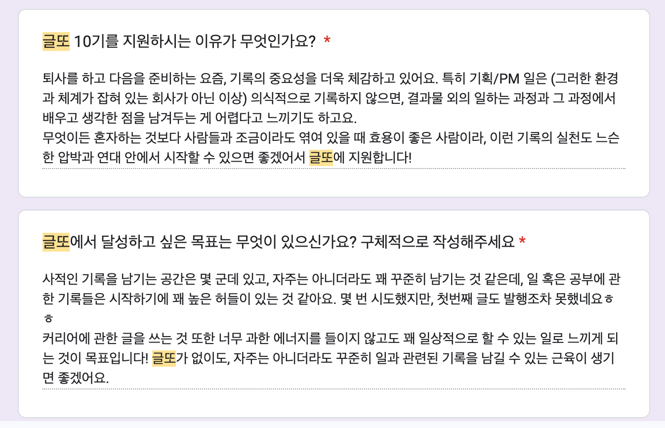 전직장동료이자 친구인 믹서가 마지막 기수에서는 PM/PO도 모집한다고 추천해주어 모집글을 읽었을 때에도, 블로그 글을 쓰고 서로 공유하는 정도가 활동의 전부인 줄로 알았다(나를 글또에 데려와준, 이제는 전 직장동료라는 말만으로는 설명할 수 없는 이것저것메이트 믹서에게 고마운 마음을 한가득 전한다💗).